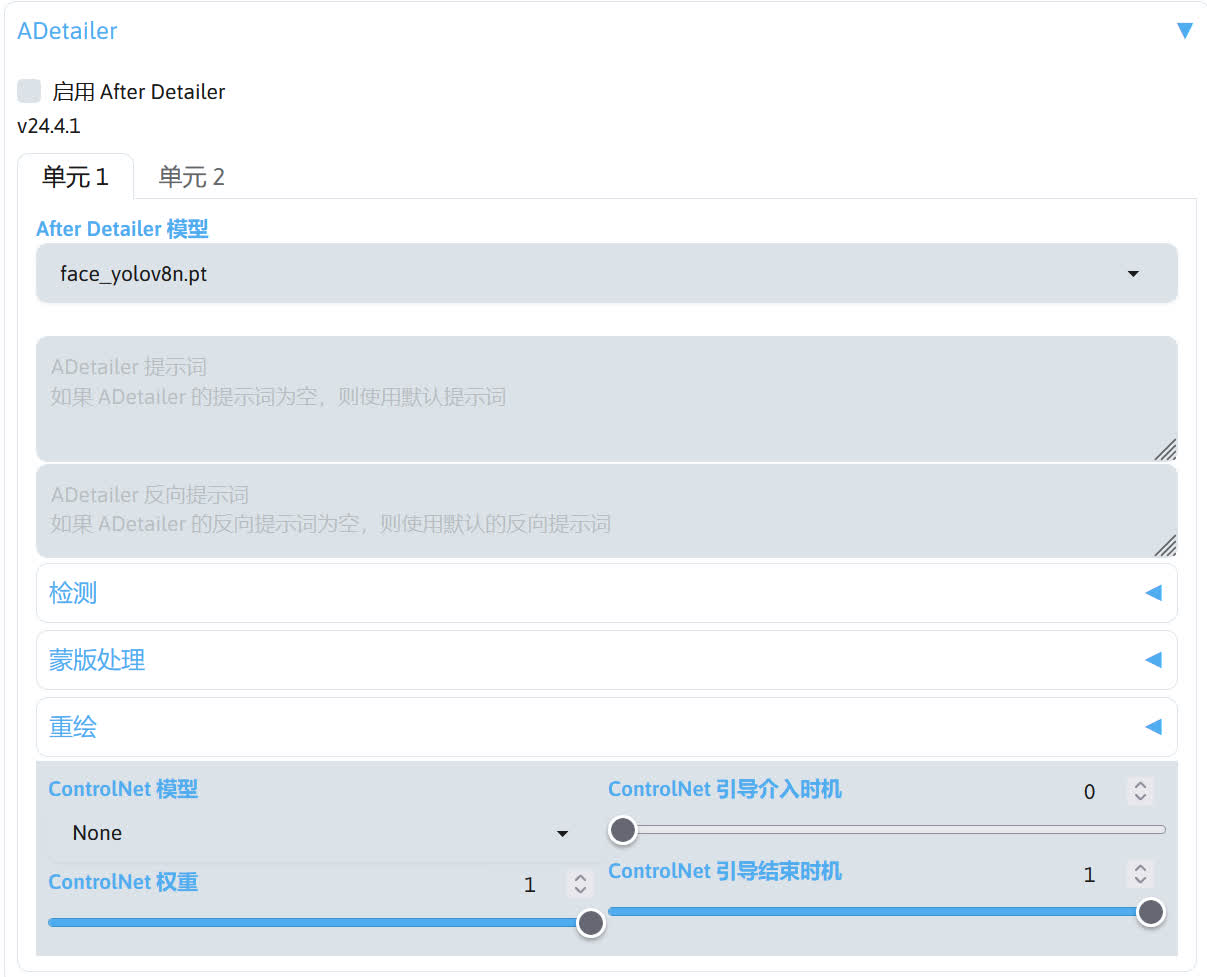 注意,在图生图的局部重绘中该扩展并不会生效,因为这个扩展的本质是自动检测面部位置并进行局部重绘。