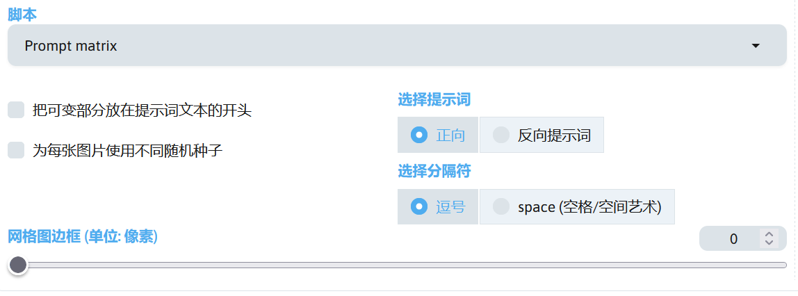 该脚本的功能类似 X/Y/Z 脚本中的 Prompt S/R 功能,通过分隔符对提示词进行组合。