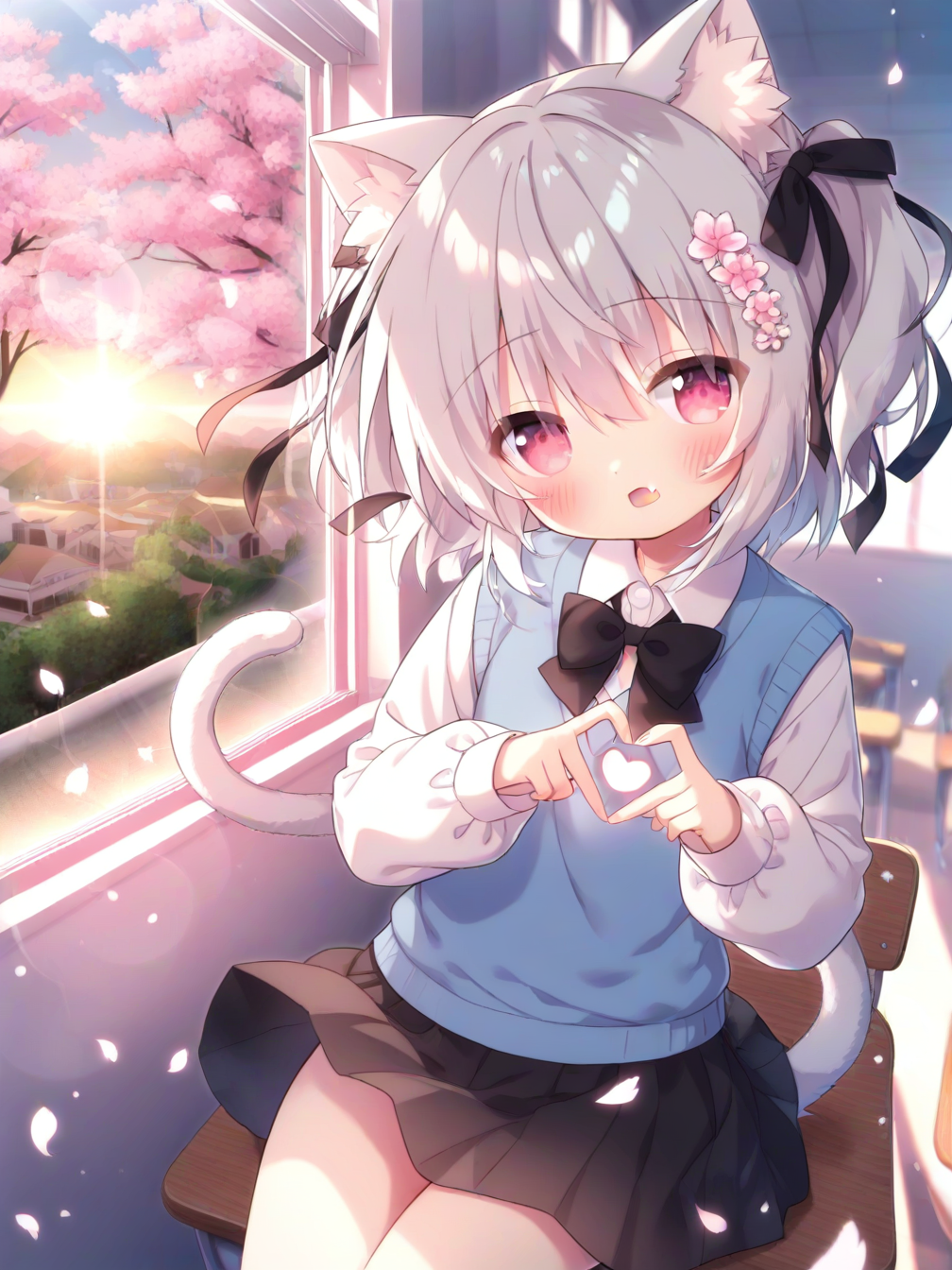 1girl,solo,cherry blossoms,hair flower,pink flower,hair ribbon,cat ears,animal ear fluff,grey hair,short hair,bangs,blue eyes,hair between eyes,eyebrows visible through hair,blush,neck ribbon,white dress,frilled collar,medium dress,petticoat,detached sleeves,flat chest,