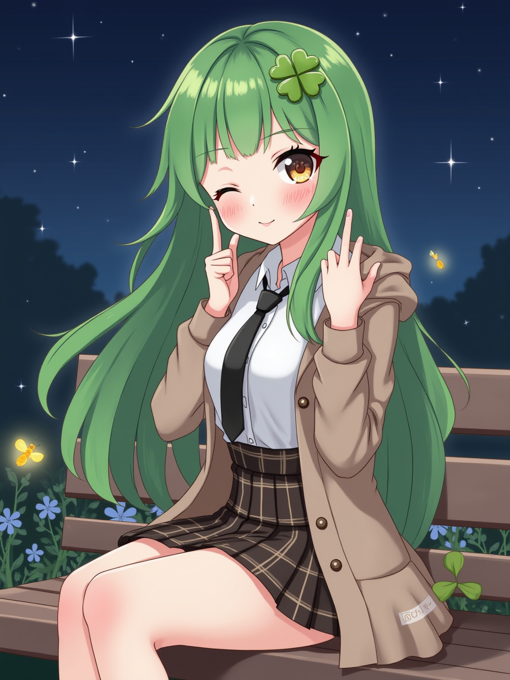 自然语言 An illustration of a girl with long green hair with bangs, braid and ahoge, and four-leaf clover as hair ornament. She has brown eyes with light smile and looking at viewer. She wears white shirt with black necktie and open jacket. The jacket is brown with hood. She is wears pleated plaid brown skirt. She is sitting on bench, a hand put on own chin and index finger is raise, closing one eye and head is tilting, the other hand is between legs. The environment is in the park at night, the night sky has some star. Some flower, butterfly and firefly near the girl. Upper body and frontal camera use_flux_with_natural_language