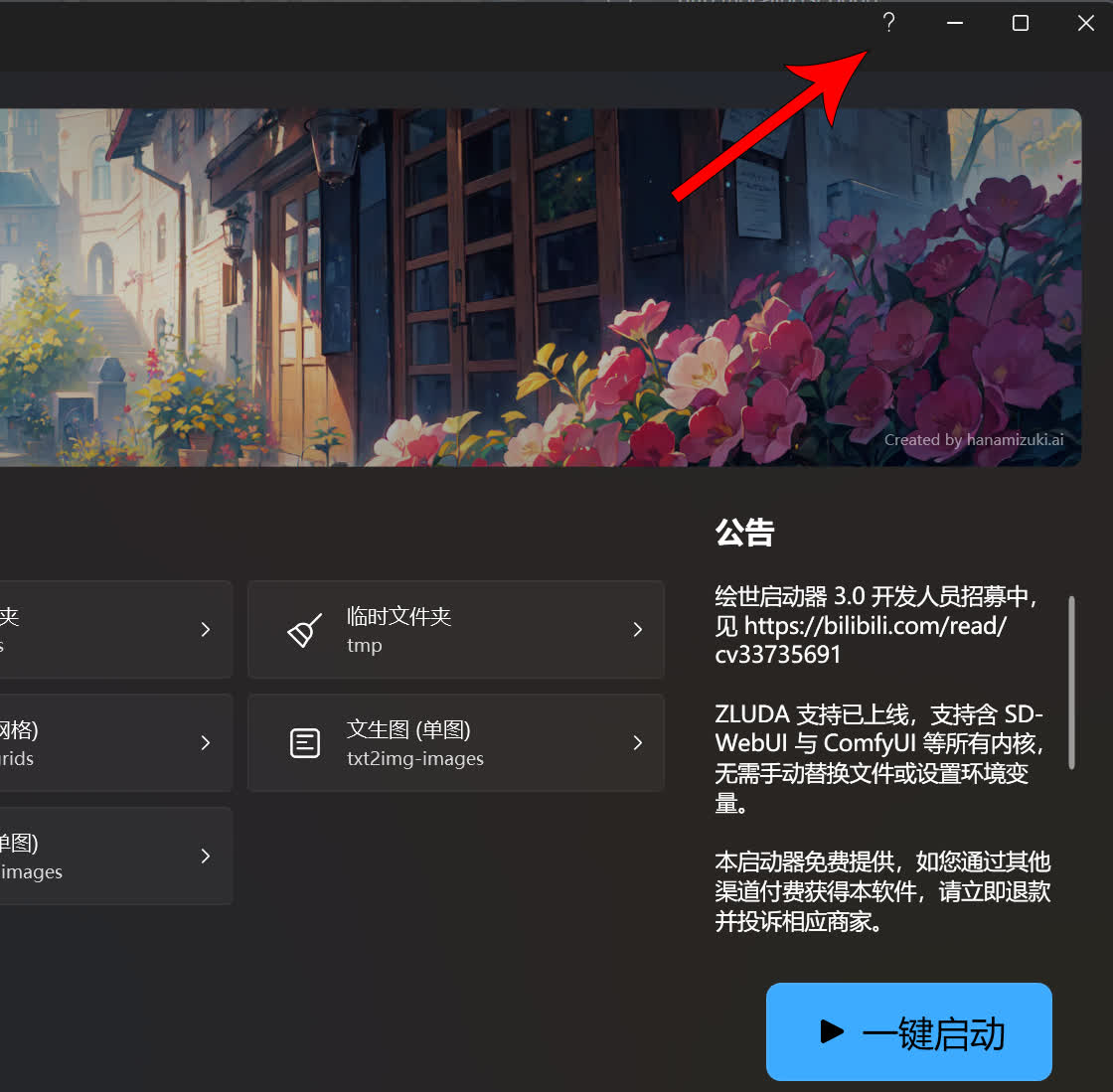 在绘世启动器的界面中点击键盘上的F1或者点击绘世启动器右上角的问号按钮,可前往绘世启动器的帮助和反馈页面