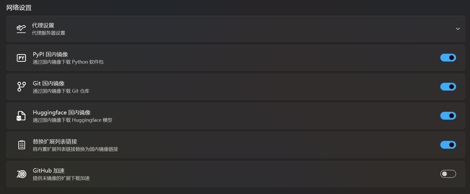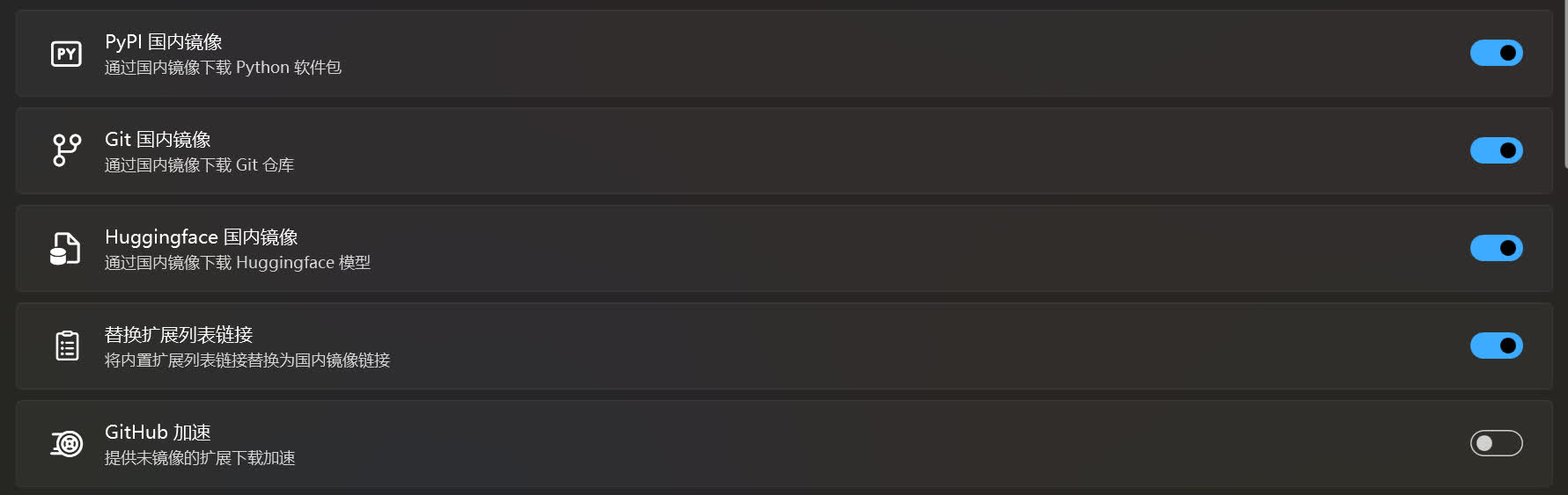 2. 当处于非国内网络环境时,请将PyPI 国内镜像Git 国内镜像Huggingface 国内镜像替换扩展远端地址这 4 个选项关闭,防止不必要的减速。