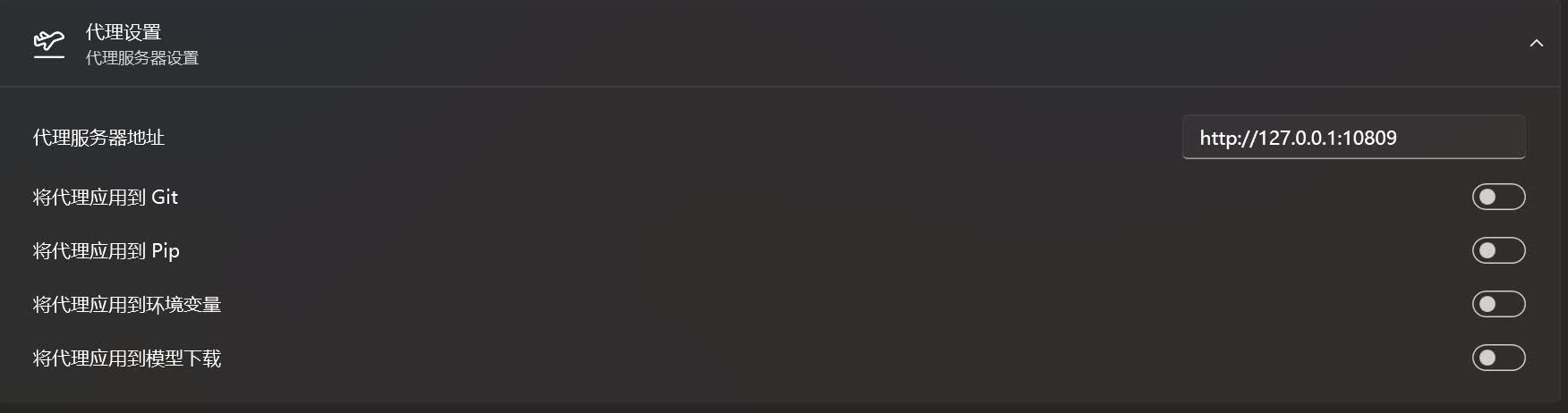 用于配置绘世启动器的代理。有些情况 SD WebUI / ComfyUI / ... 需要从 Huggingface 等网站下载缺失的模型,而此时绘世启动器的 Huggingface 国内镜像中没有对应的镜像文件,这时候只能通过配置绘世启动器的代理来解决。