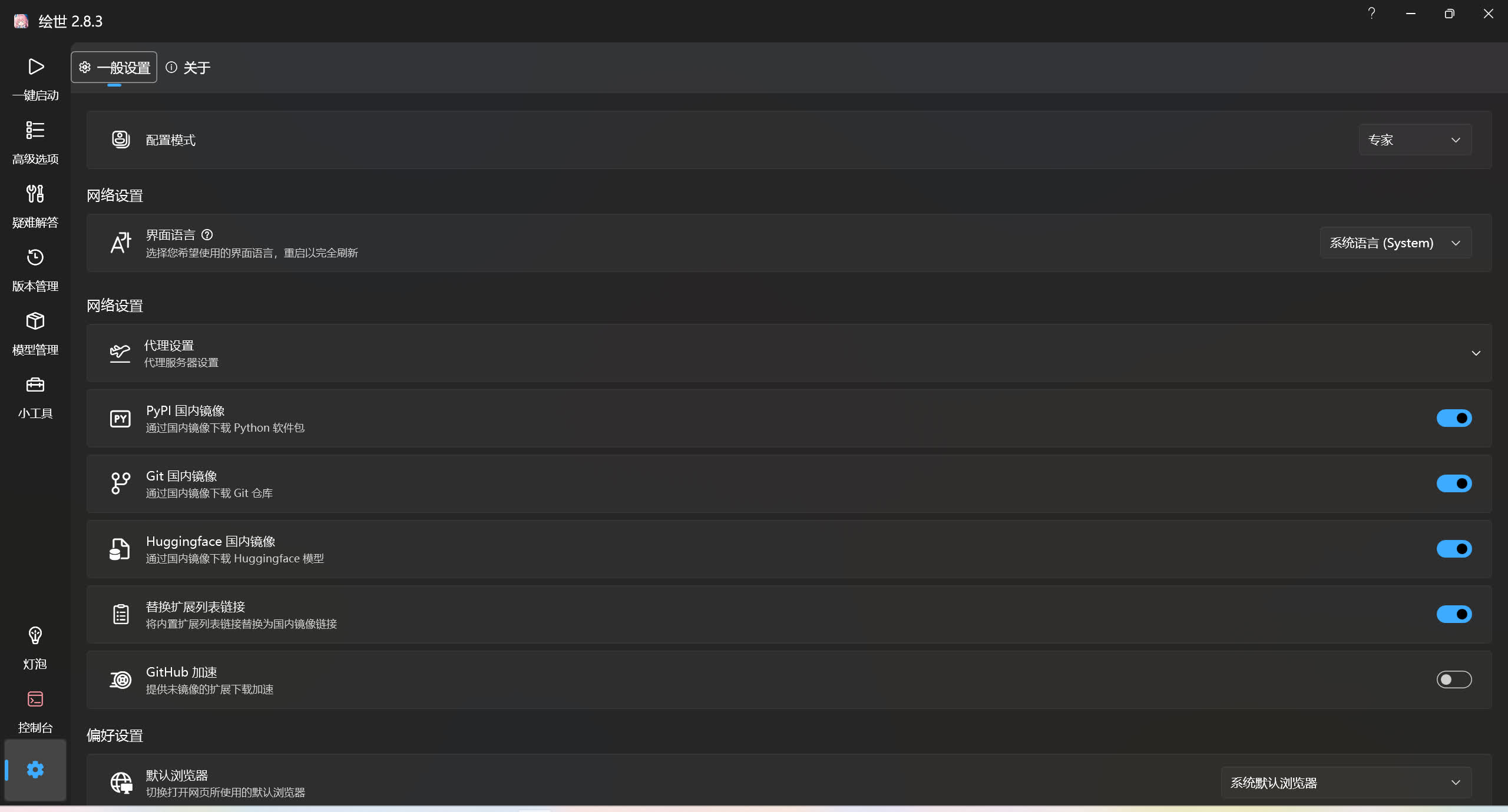 调整绘世启动器的设置显示,默认为新手模式,将隐藏部分高级选项。选择更高级的配置模式后将显示更多被隐藏的高级选项。
